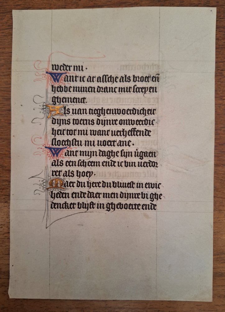 15th Century Dutch Manuscript leaf on Vellum. With initials heightened in Gold