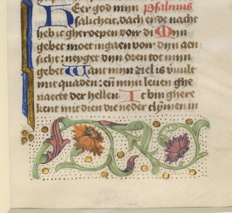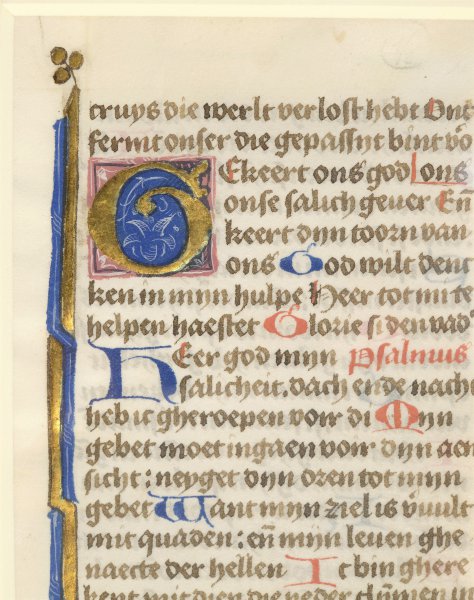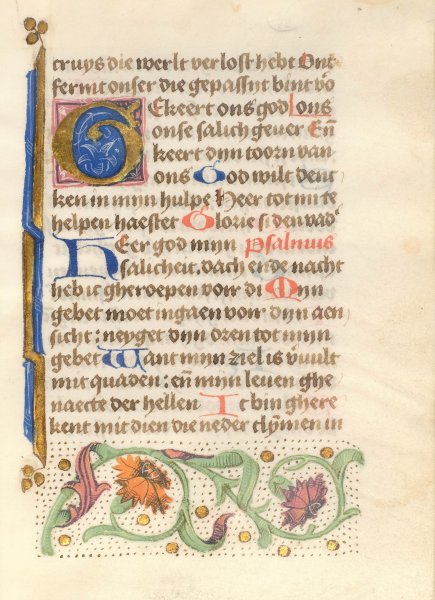 | 15th century manuscript leaf Dutch with flowers and initial (framed)15th century manuscript leaf Dutch with flowers and initial (framed)