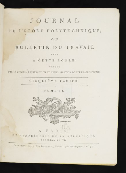 | Journal de l'école royale polytechnique, ou bulletin du travail fait a cette école, publié par le conseil d'instruction de cet établissement. Cinquième cahier. Tome II. A Paris, De l'imprimerie de la...Journal de l'école royale polytechnique, ou bulletin du travail fait a cette école, publié par le conseil d'instruction de cet établissement. Cinquième cahier. Tome II. A Paris, De l'imprimerie de la républqiue. Prairial an VI. Et se trouve chez le C.en Bernard, libraire , quai des Augustins, n. 37.