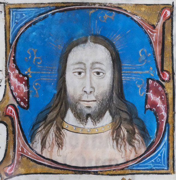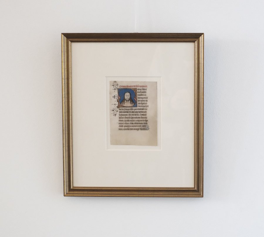 Framed 15 century manuscript leaf on vellum from book of hours (Brugge) with miniature of Jesus.Framed 15 century manuscript leaf on vellum from book of hours (Brugge) with miniature of Jesus.