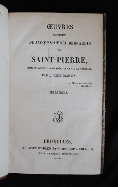 | Oeuvres complètes de Jaques-Henri-Bernardin de Saint-Pierre, mises en ordre et précédées de la vie de l'auteur, par L. Aimé-Martin. Mélanges tome 1 & 2. | € 50.00 Aimé Martin, 1820 | moreinfo more information |