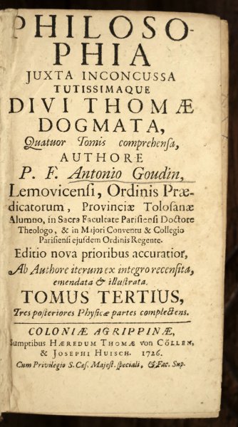 | Philosophia juxta inconcussa tutissimaque divi Thomae dogmata, Quatuor Tomis comprehensa, authore P. F. Antonio Goudin, Lemovicensi, Ordinis Praediatorum, Provinciae Tolosanae Alumno, in Sacra Facultate P...Philosophia juxta inconcussa tutissimaque divi Thomae dogmata, Quatuor Tomis comprehensa, authore P. F. Antonio Goudin, Lemovicensi, Ordinis Praediatorum, Provinciae Tolosanae Alumno, in Sacra Facultate Parisiensi Doctore Theologo, & in Majori Conventu & Collegio Parisiensi ejusdem Ordinis Regente. Editio nova prioribus accuratior, Ab Authore iterum ex integro recensita, emendata & illustrata. Tomus tertius, Tres posteriores Physicae partes complestens. Coloniae Agrippinae. Rumptibus Haeredum Thomae von Cöllen, & Joseph Huisch. 1726. Cum Pivilegio S. Caef. Majest. Speciali.
