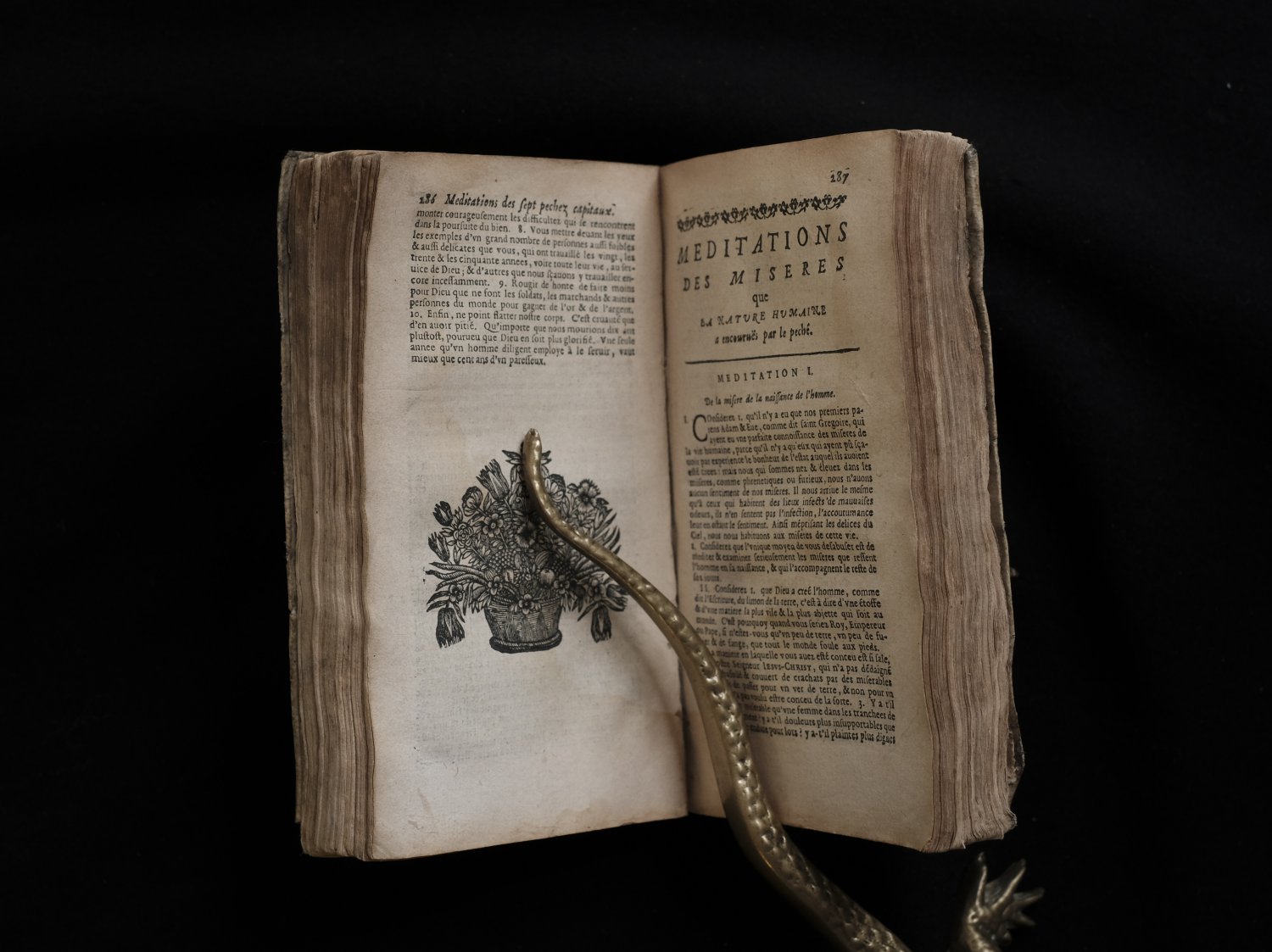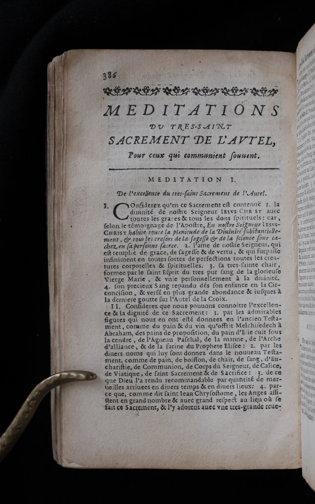 Three parts and 'Regles de conduite pour les curez' in one binding. Some letters are decorated, and beginnings of parts also have some decoration.