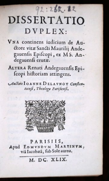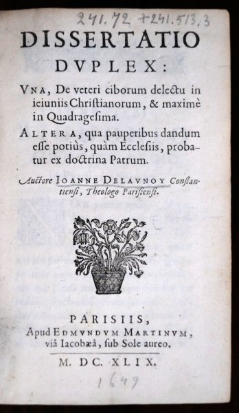 | Dissertatio Duplex: Una, De veteri ciborum delectu in ieiuniis Christianorum, & maximè in Quadragesima. Altera, qua pauperibus dandum esse potiùs, quàm Ecclesiis, probatur ex doctrina Patrum. Auctore I...Dissertatio Duplex: Una, De veteri ciborum delectu in ieiuniis Christianorum, & maximè in Quadragesima. Altera, qua pauperibus dandum esse potiùs, quàm Ecclesiis, probatur ex doctrina Patrum. Auctore Ioanne Delaunoy Constantiensi, Theologo Parisiensi. Parisiis, Apud Edmundum Martinum,