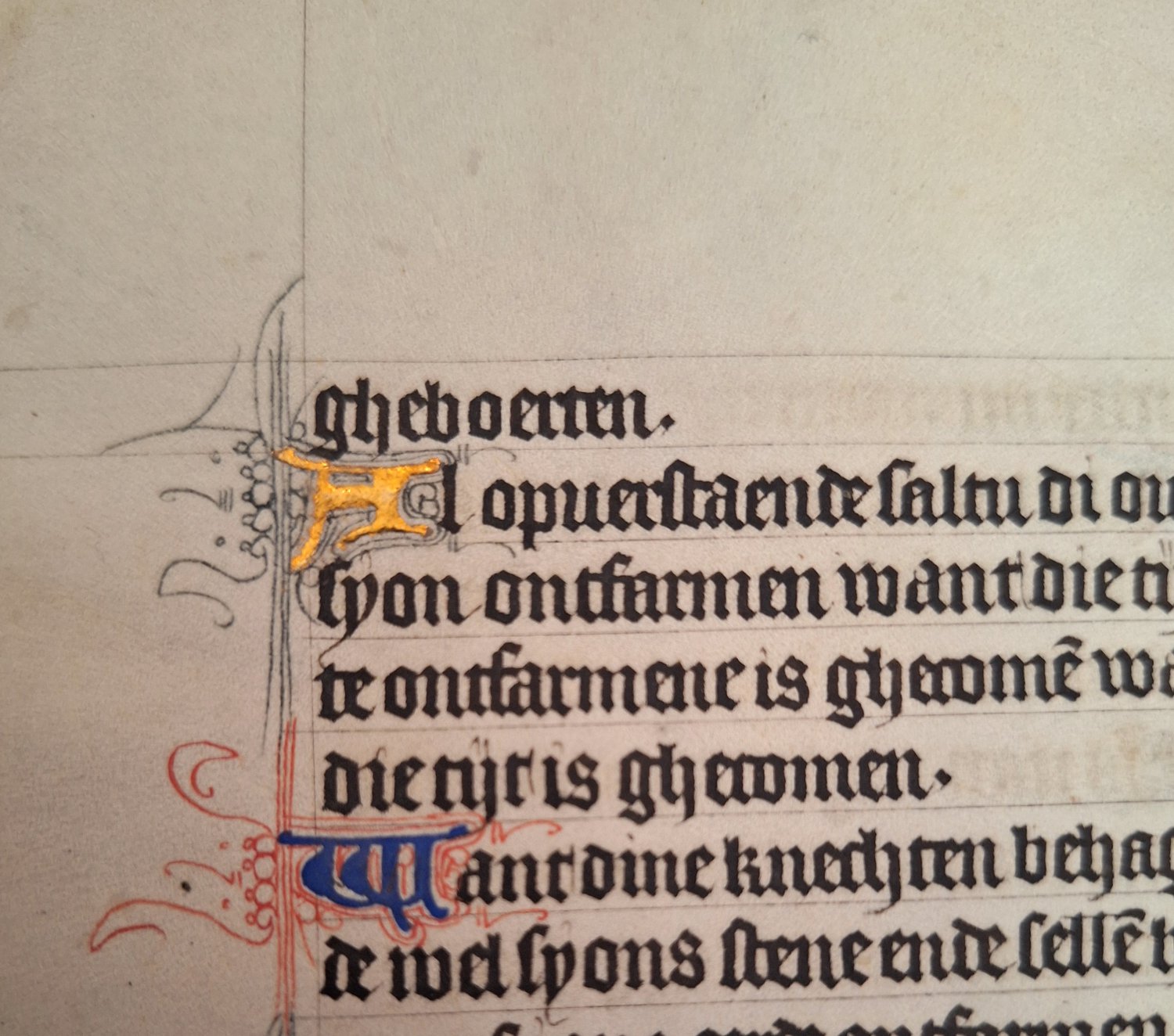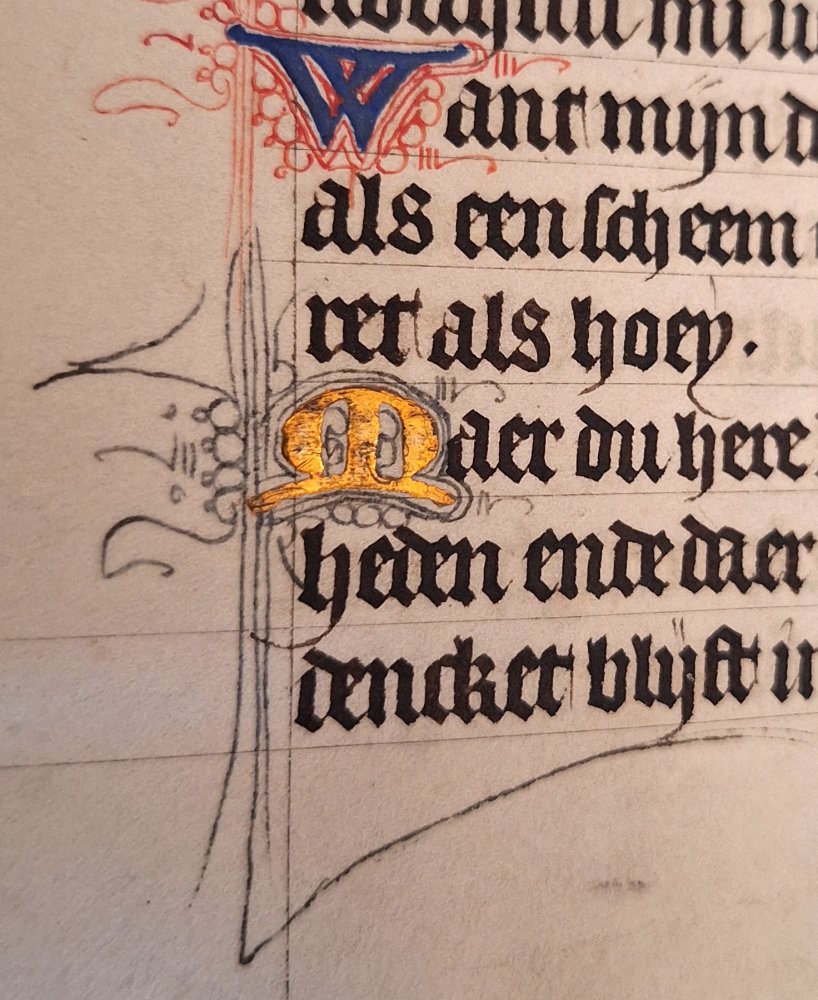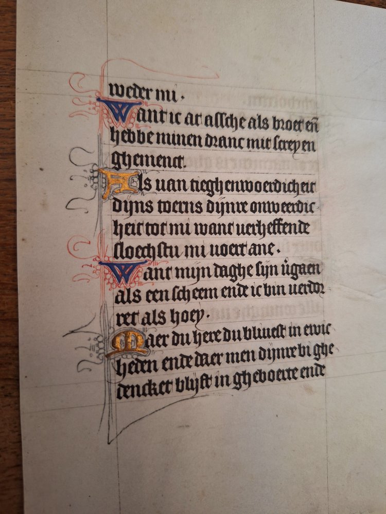 15th Century Dutch Manuscript leaf on Vellum. With initials heightened in Gold