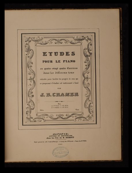 | Etudes pour le piano en quatre-vingt quatre Exercices dans les differens tons calcules pour faciliter les progres de ceux qui se proposent d'etudier cet instrument a fond Par J.B. Cramer Mayence ANVERS ET...Etudes pour le piano en quatre-vingt quatre Exercices dans les differens tons calcules pour faciliter les progres de ceux qui se proposent d'etudier cet instrument a fond Par J.B. Cramer Mayence ANVERS ET BRUXELLES Chez les fils de B. SCHOTT Depotgeneral de notro fonds de Musique: a leipzig chez Gme Haertel a Vienne chez H.F. Muller