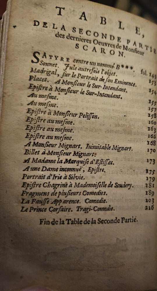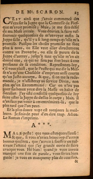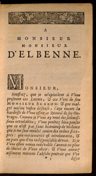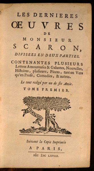 | Les dernieres oeuvres de monsieur Scaron, divisees en deux parties. Contenantes Plusieurs Lettres Amoureuses & Galantes, Nouvelles, Histoires, plusieurs, Pieces, tant en vers qu'en prose, Comedies, & aut...Les dernieres oeuvres de monsieur Scaron, divisees en deux parties. Contenantes Plusieurs Lettres Amoureuses & Galantes, Nouvelles, Histoires, plusieurs, Pieces, tant en vers qu'en prose, Comedies, & autres. Le tout redigé par un de ses Amis. Suivant la Copie Imprimée A Paris, MDCLXVIII.