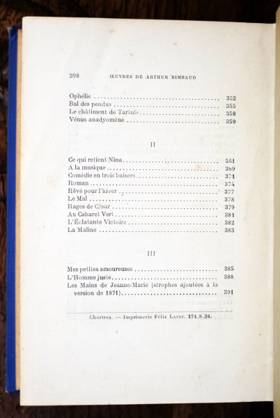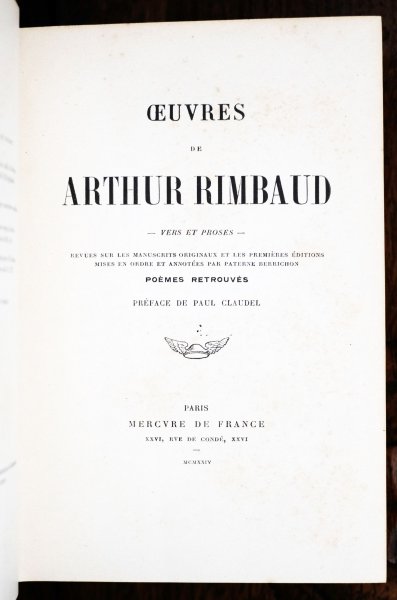 | Oeuvres de Arthur Rimbaud, Vers et Proses, Revues sur les Manuscrits originaux et les premiéres Éditions mises en ordre et annotées par Paterne Berrichon, Poémes Retrouvés, Préface de Paul Claudel. Oeuvres de Arthur Rimbaud, Vers et Proses, Revues sur les Manuscrits originaux et les premiéres Éditions mises en ordre et annotées par Paterne Berrichon, Poémes Retrouvés, Préface de Paul Claudel.