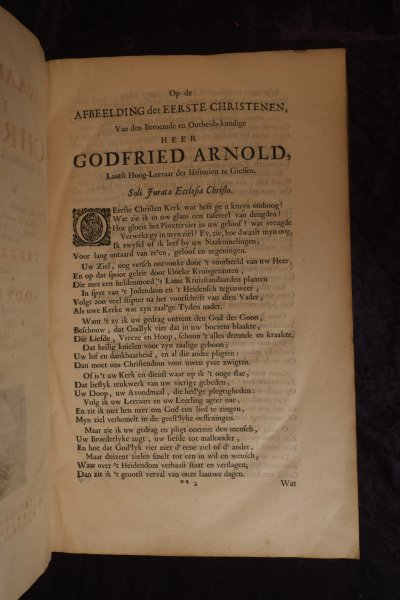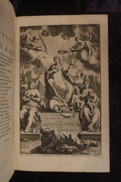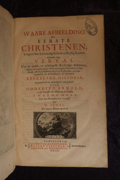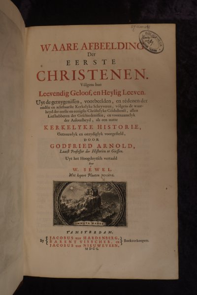| Waare afbeelding Der eerste christenen. Vólgens hun Leevendig Geloof, en Heylig Leeven. Uyt de getuygenissen, voorbeelden, en rédenen der oudste en achtbaarste Kerkelyke Schryveren, vólgens de waarheyd...Waare afbeelding Der eerste christenen. Vólgens hun Leevendig Geloof, en Heylig Leeven. Uyt de getuygenissen, voorbeelden, en rédenen der oudste en achtbaarste Kerkelyke Schryveren, vólgens de waarheyd der eerste en eenigste Christelyke Gódsdienst, allen Liefhebberen der Geschiedenissen, en voornamelyk der Aaloudheyd, als een nutte Kerkelyke Historie, Getrouwelyk en onzydiglyk voorgesteld, door Godfried Arnold, Laatst Professor der Historiën te Giessen. Uyt het Hoogduytsch vertaald door W. Séwel. Met kopere Plaaten vercierd. t'Amsterdam, By Jacobus van Hardenberg, Barent Visscher, en Jacobus van Nieuweveen, Boekverkoopers. MDCC.