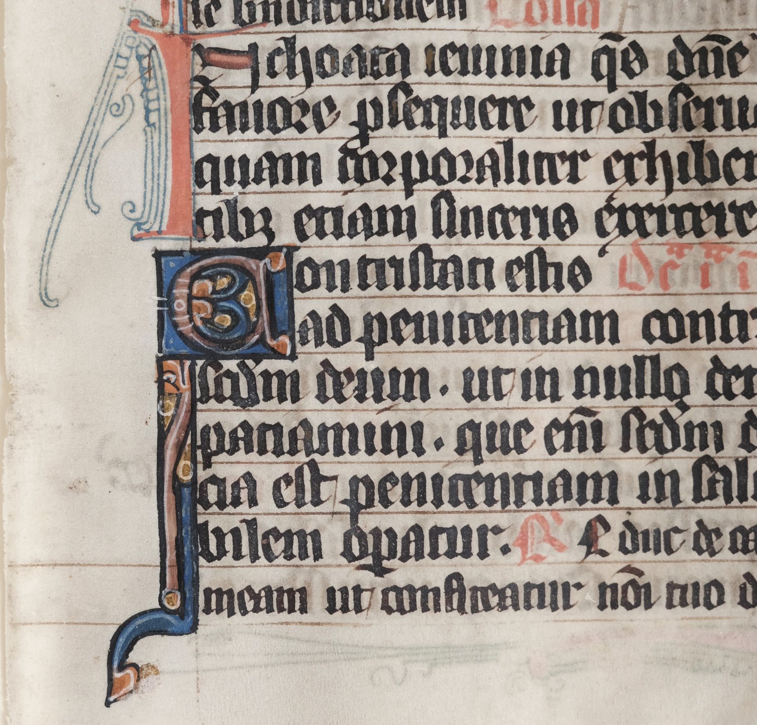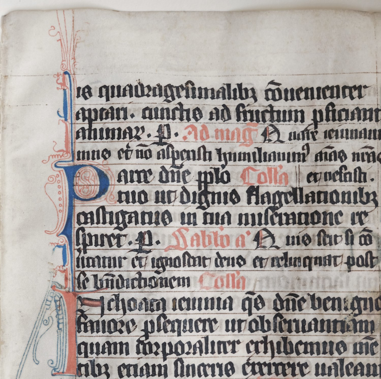 Rare manuscript leaf from the 14th century that is decorated, which is exceptional for leaves from that period. With letter heightened in gold.Professionally framed with UV resistant glass. Seize manuscript: Height: 14 cm Width: 10 cm.