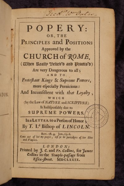| Popery or, the Principles and Positions Approved by the Church of Rome, When Really Believ'd and Practis'd, Are very Dangerous to all, and to Protestant Kings and Supreme Powers, more especially Perniciou...Popery or, the Principles and Positions Approved by the Church of Rome, When Really Believ'd and Practis'd, Are very Dangerous to all, and to Protestant Kings and Supreme Powers, more especially Pernicious, and Inconsistent with that Loyalty, which by the Law of Nature and Scripture Is Indispensably due to Supreme Powers. In a Letter to a Person of Honor, by T. Ld Bishop of Lincoln. Rev. 18.4. Jer.15.6. Come out of her my people, lest ye be partakers of her Sins and Plagues. London, Printed by J.C. and Fr. Collins, for James Collins in the Temple passage from Essex Street. MDCLXXIX.