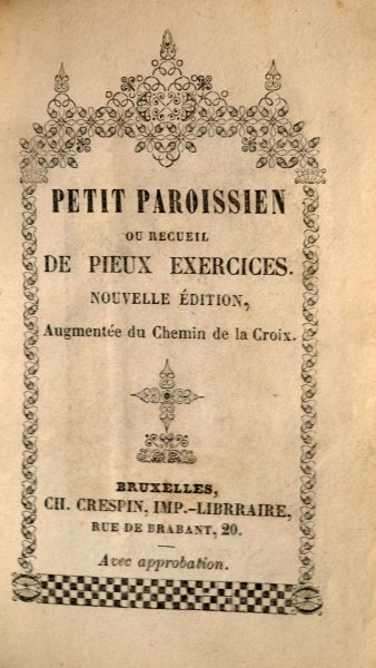 | Petit Paroissien ou recueil De Pieux Exercices. Nouvelle Édition, Augmentée du Chemin de la Croix. Bruxelles, Ch. Crespin, Imp. -Libraire, rue de Brabant, 20. Avec approbation.Petit Paroissien ou recueil De Pieux Exercices. Nouvelle Édition, Augmentée du Chemin de la Croix. Bruxelles, Ch. Crespin, Imp. -Libraire, rue de Brabant, 20. Avec approbation.