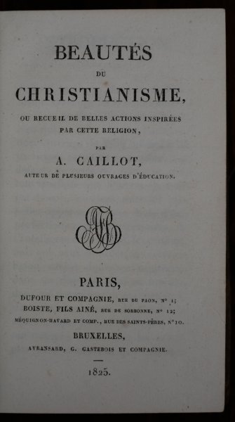 | Beautés du Christianisme ou Recueil de belles actions inspirées pav cette religion. Par A. Caillot, Auteur de plusieurs Ouvrages d'Education. A Paris. 1825. | € 25.00 A. Caillot, 1825 | moreinfo more information |