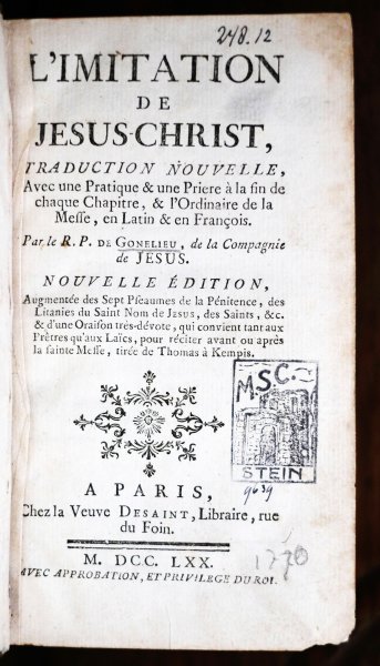 | L'imitation de Jesus-Christ, traduction nouvelle, Avec une Pratique & une Priere à la fin de chaque Chapitre, & l'Ordinaire de la Messe, en Latin & en François. Par le R.P. de Gonelieu, de la Compagnie ...L'imitation de Jesus-Christ, traduction nouvelle, Avec une Pratique & une Priere à la fin de chaque Chapitre, & l'Ordinaire de la Messe, en Latin & en François. Par le R.P. de Gonelieu, de la Compagnie de Jesus. Nouvelle Édition, Augmentée des Sept Pseaumes de la Pénitence, des Litanies du Saint Nom de Jesus, des Saints, &c. & d'une Oraison trés-dévote, qui convient tant aux Prêtres qu'aux Laïcs, pour réciter avant ou aprés la sainte Messe, tirée de Thomas á Kempis.