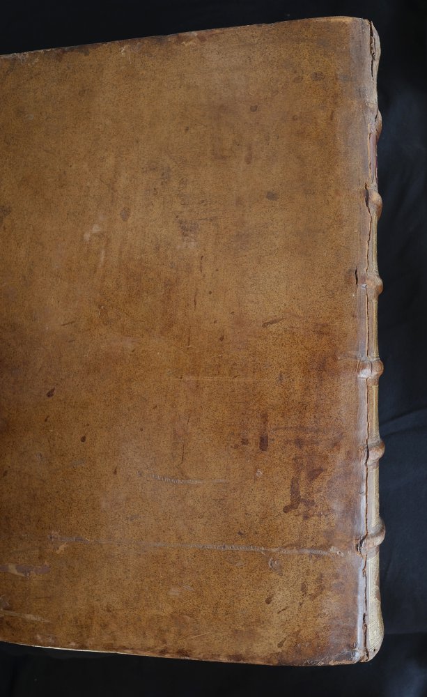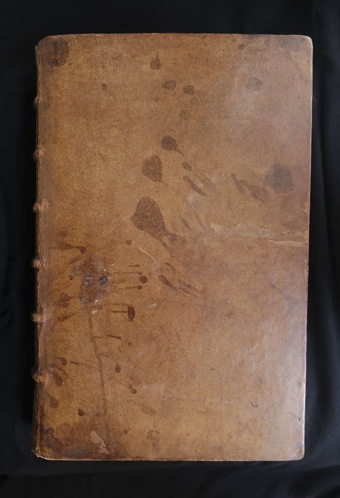 The front and rear joints of the book are split, but the covers are still attached to the book. The top of the text block is slightly damaged, but this does not affect the text.