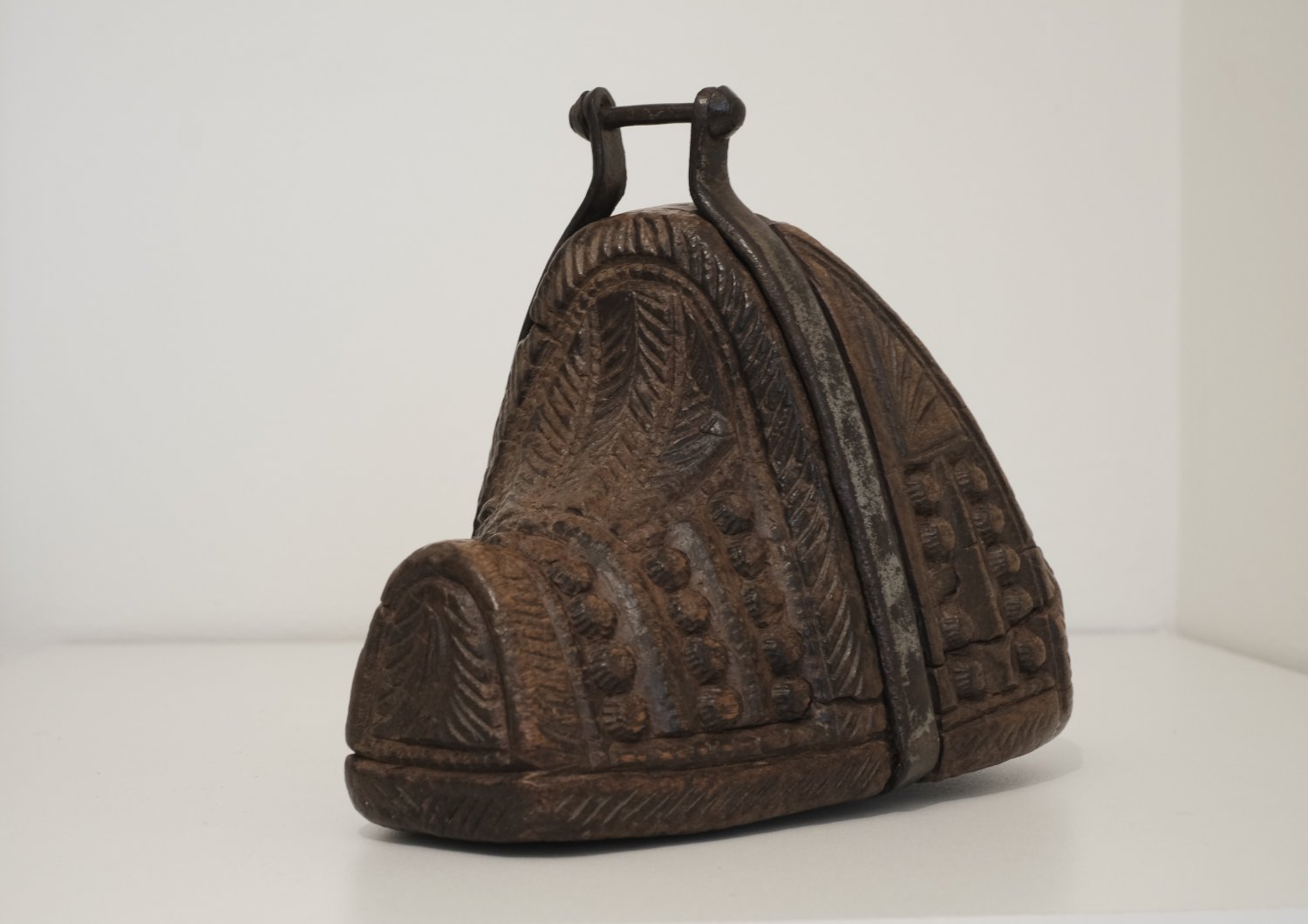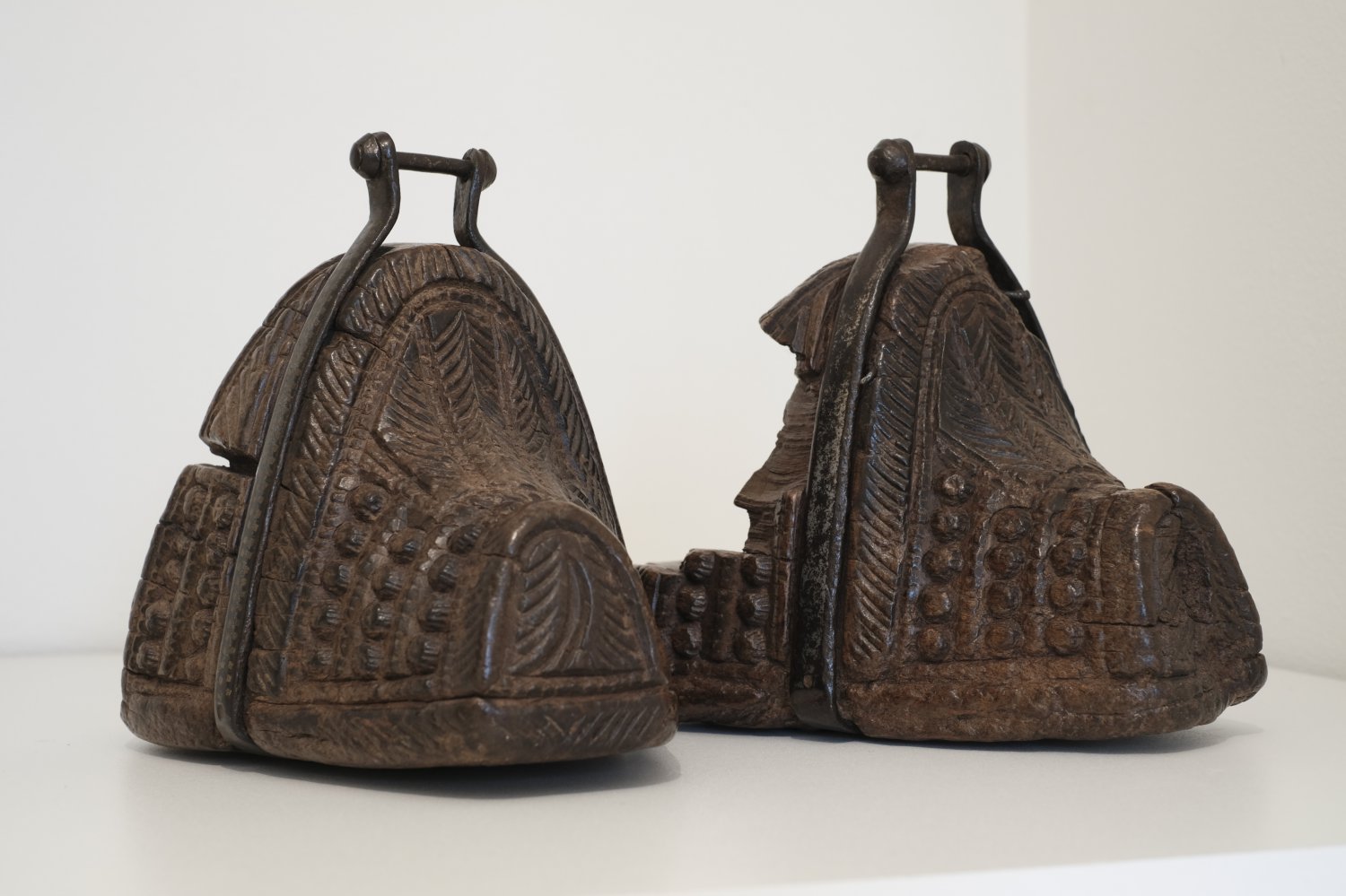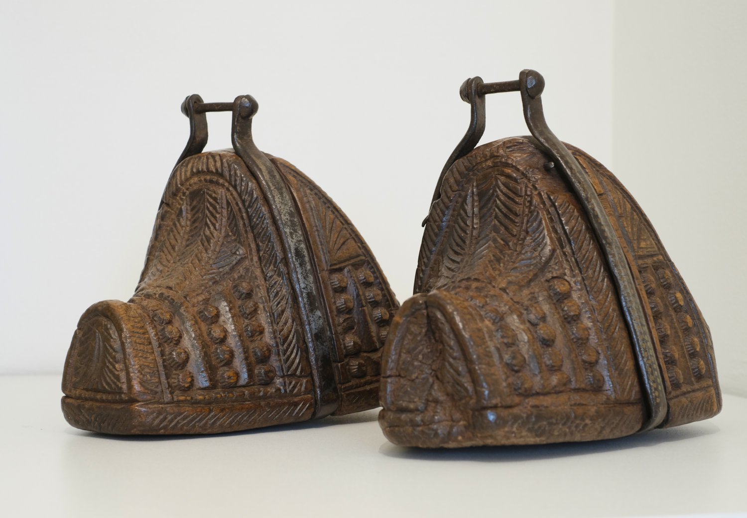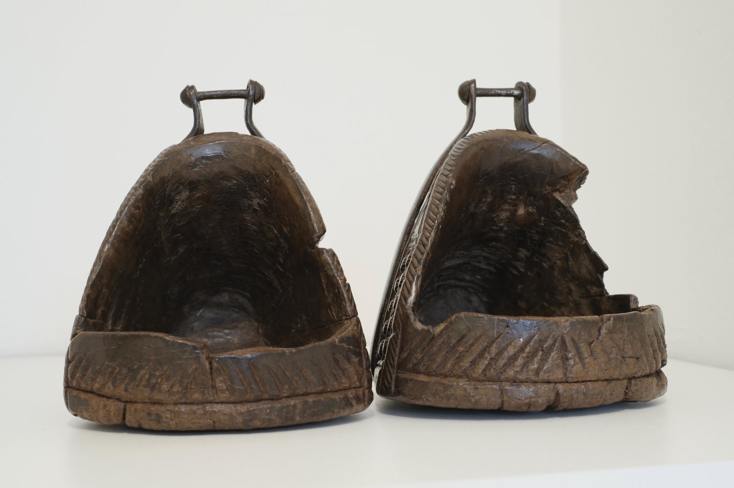 Dimensions each stirup ca. 18 cm H, 15 cm W, 21 cm D.Material: wood and metal. Not dated, date is an estimate.