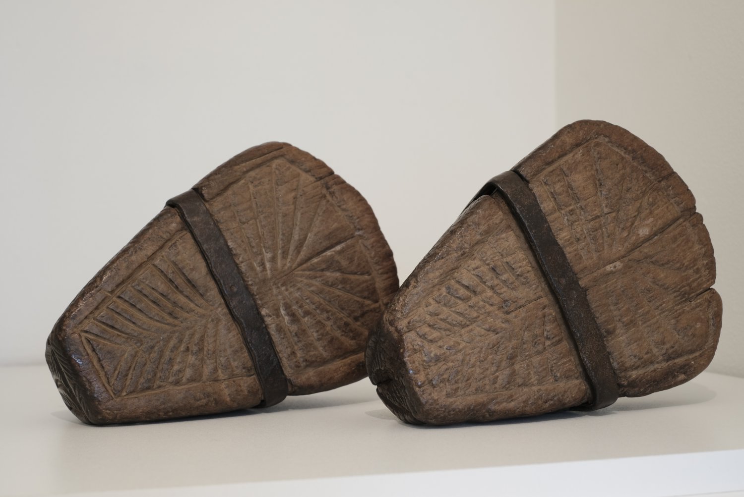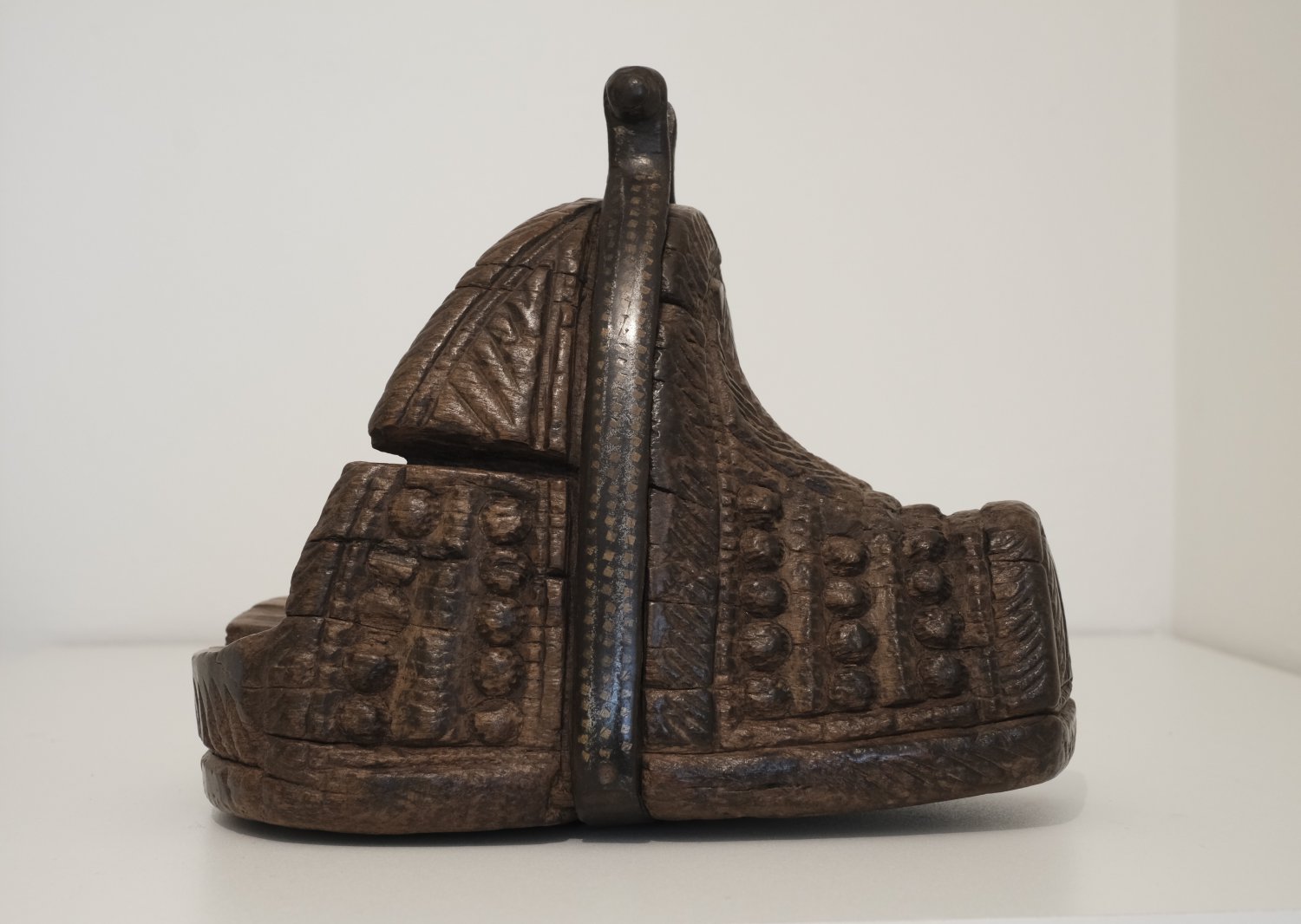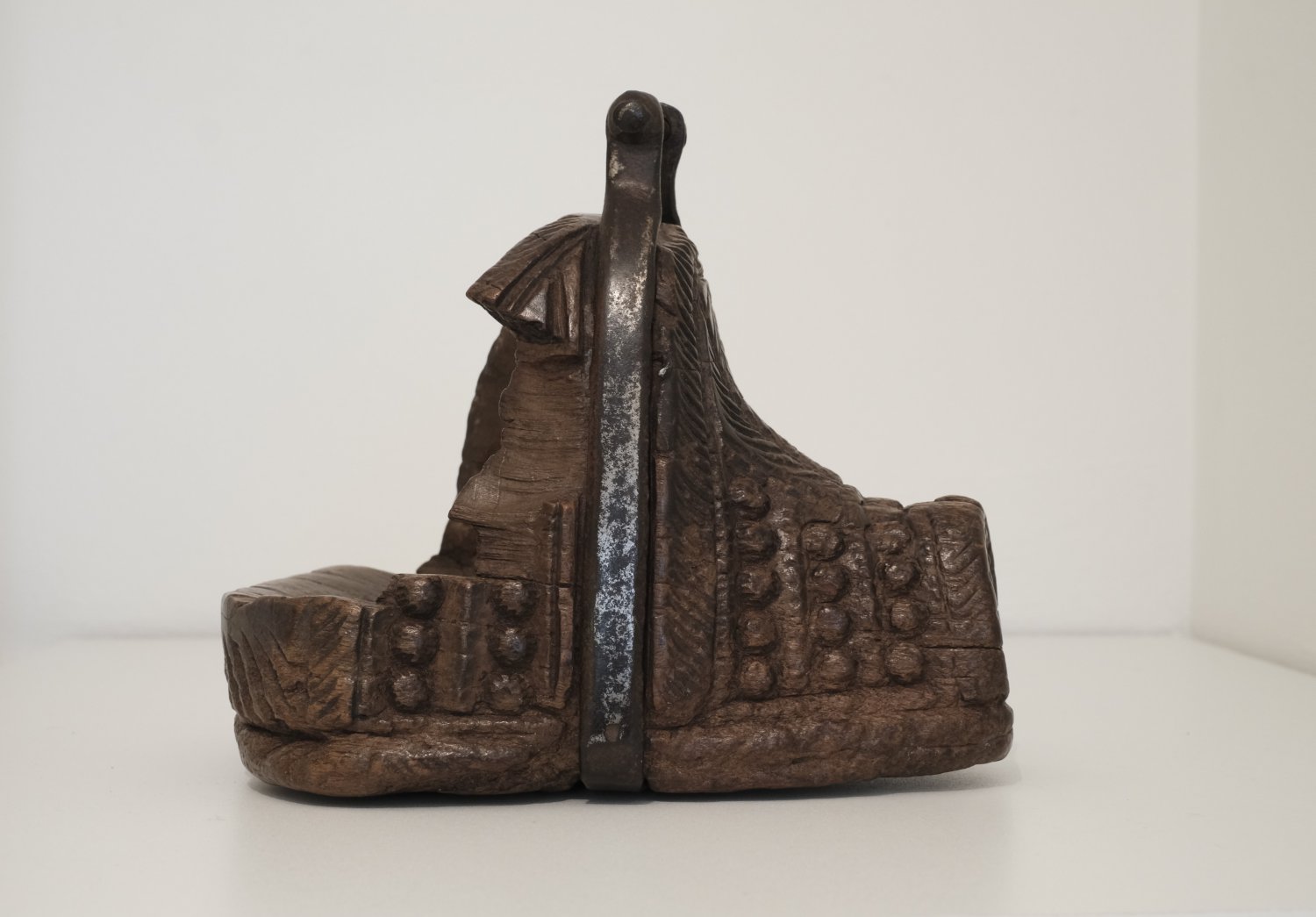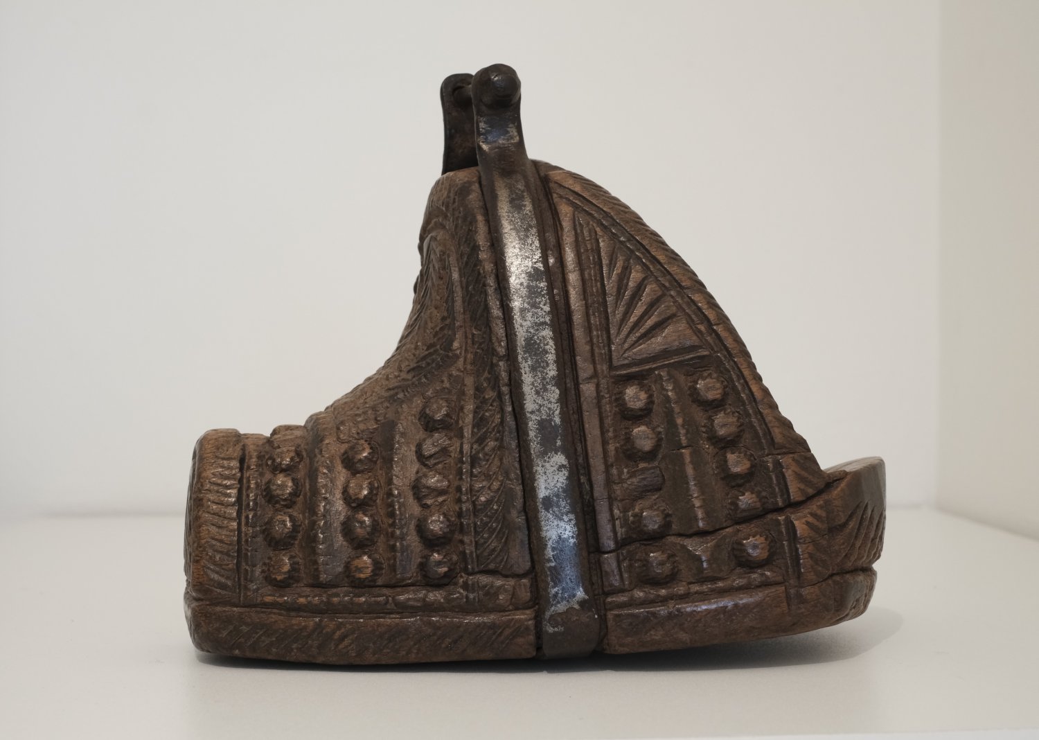 Dimensions each stirup ca. 18 cm H, 15 cm W, 21 cm D.Material: wood and metal. Not dated, date is an estimate.