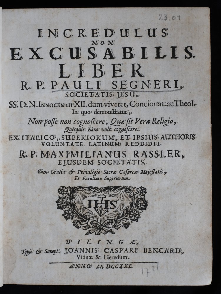 | Incredulus non Excusabilis Liber, R.P.Pauli Segneri, societatis Jesu, SS.D.N. Innocentii XII. dum viveret Concionat ac Theol. ,Ex Italico, Superiorum et ipsius authoris voluntate latinum reddidit ,R.P. Ma...Incredulus non Excusabilis Liber, R.P.Pauli Segneri, societatis Jesu, SS.D.N. Innocentii XII. dum viveret Concionat ac Theol. ,Ex Italico, Superiorum et ipsius authoris voluntate latinum reddidit ,R.P. Maximilianus Rassler, Dilingae, Joannis Caspari Bencard, Viduae & Heredum; anno 1721