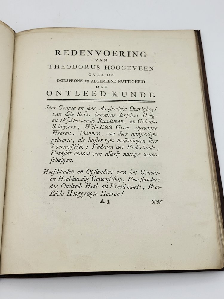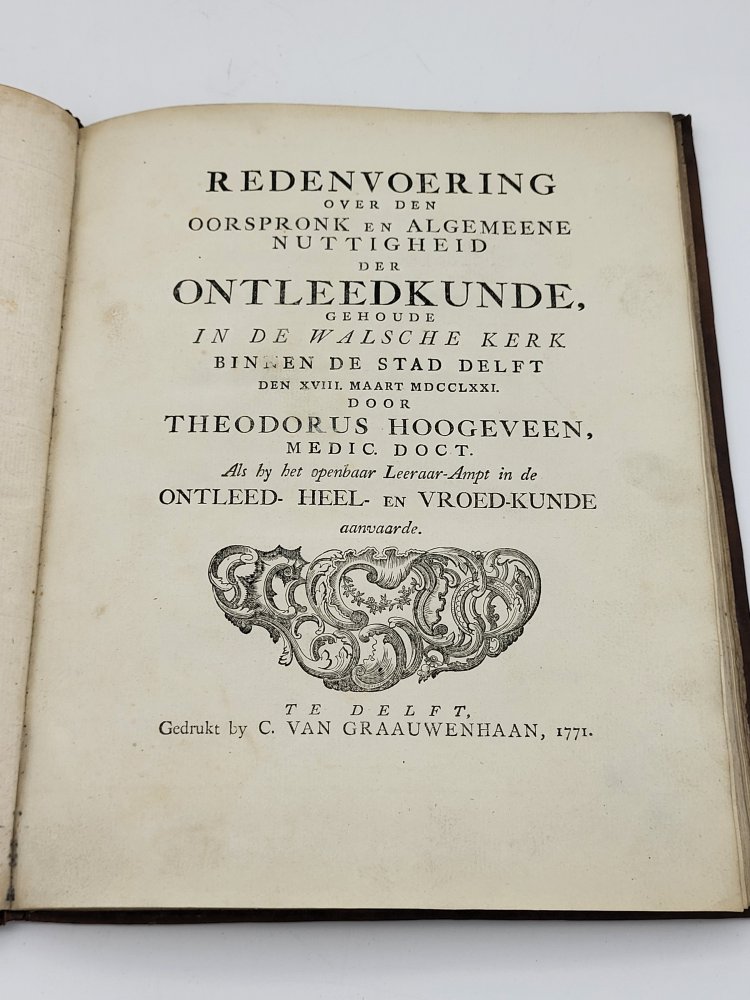 | Redenvoering over den Oorspronk en Algemeene Nuttigheid der Ontleedkunde gehoude in de Walsche Kerk binnen de stad Delft. | € 995.00 T Hoogeveen, 1771 | moreinfo more information |