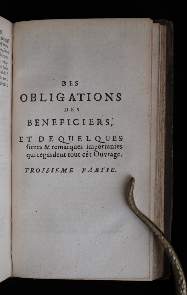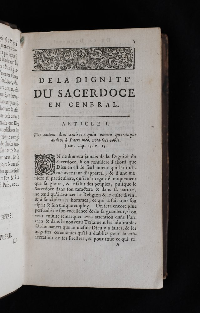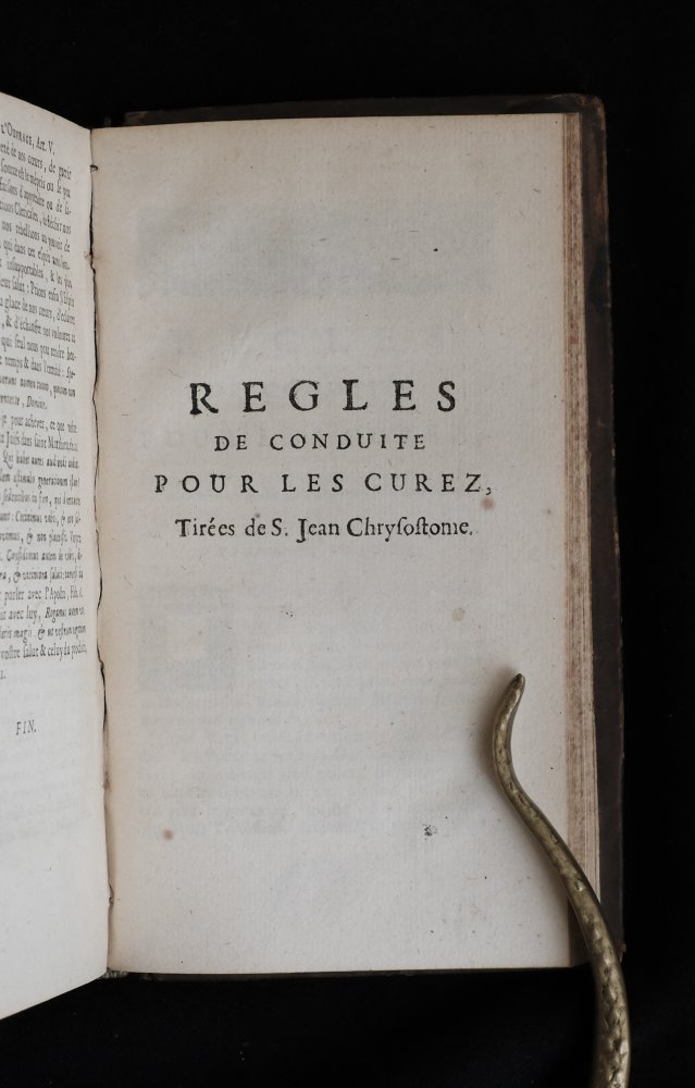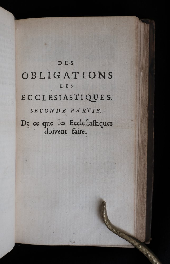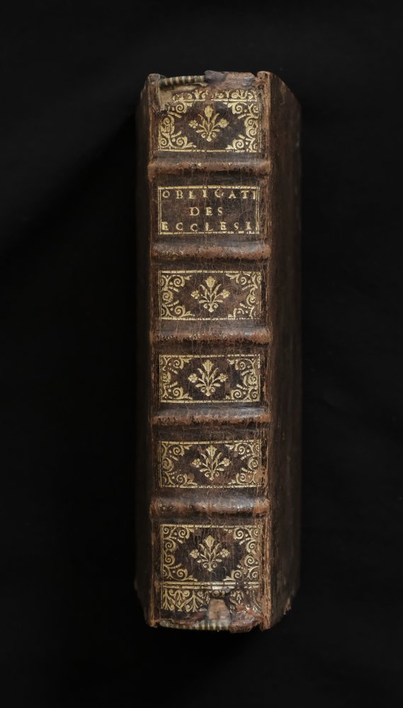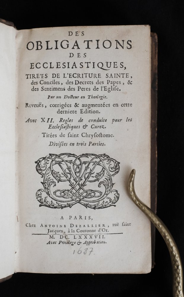 | des Obligations des Ecclesiastiques, tire'es de l'ecriture sainte, des conciles, des decrets des papes, des sentimens des peres de l'eglise. par un docteur en theologie, avec XII regles de conduite pour l...des Obligations des Ecclesiastiques, tire'es de l'ecriture sainte, des conciles, des decrets des papes, des sentimens des peres de l'eglise. par un docteur en theologie, avec XII regles de conduite pour les ecclesiastiques curez. tirées de saint Chrysostome, divisees en trois parties, a Paris, chez Antoine Dezallier, rue saint Jacques, à la Couronne d'Or, MDCLXXXVII (1687))