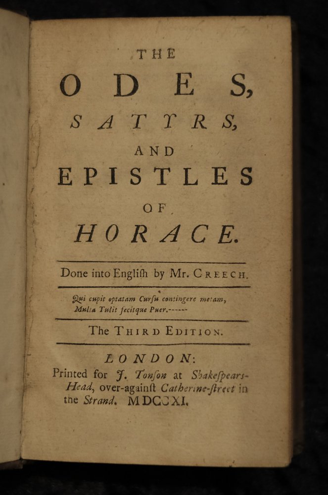 | The odes, satyrs, and epistles of Horace. Done into English by Mr. Creech. Lui cupit optatam Cursu contigere metam, Multa Tulit fecitque Puer. The Third Edition. London: Printed for J. Tonson at Shakespea...The odes, satyrs, and epistles of Horace. Done into English by Mr. Creech. Lui cupit optatam Cursu contigere metam, Multa Tulit fecitque Puer. The Third Edition. London: Printed for J. Tonson at Shakespears-Head, over-against Catherine-street in the Strand. MDCCXI.