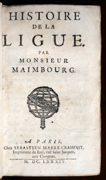 | Histoire de la Ligue. Par Monsieur Maimbourg. A Paris, Chez Sebastien Mabre Cramoisy. Imprimeur du Roy, ruë Saint Jacques, aux Cicognes. M. DC. LXXXIV.Histoire de la Ligue. Par Monsieur Maimbourg. A Paris, Chez Sebastien Mabre Cramoisy. Imprimeur du Roy, ruë Saint Jacques, aux Cicognes. M. DC. LXXXIV.
