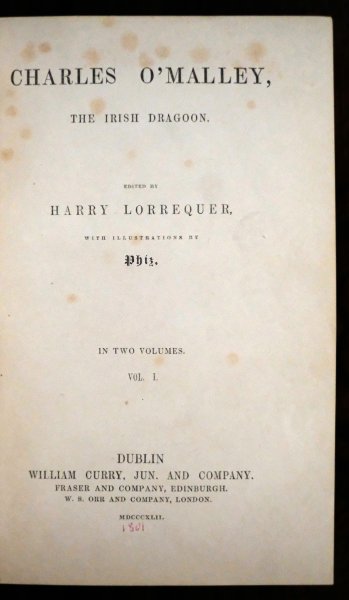 | Charles O'Malley, the Irish Dragoon. Edited by Harry Lorrequer, with illustrations by Whis. In two volumes Vol. I / II, Dublin William Curry, Jun. and Company. Fraser and Company, Edinburgh. W. S. Orr and...Charles O'Malley, the Irish Dragoon. Edited by Harry Lorrequer, with illustrations by Whis. In two volumes Vol. I / II, Dublin William Curry, Jun. and Company. Fraser and Company, Edinburgh. W. S. Orr and Company, London. MDCCXLII.