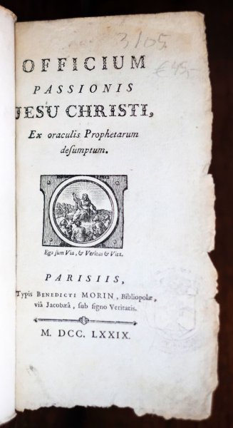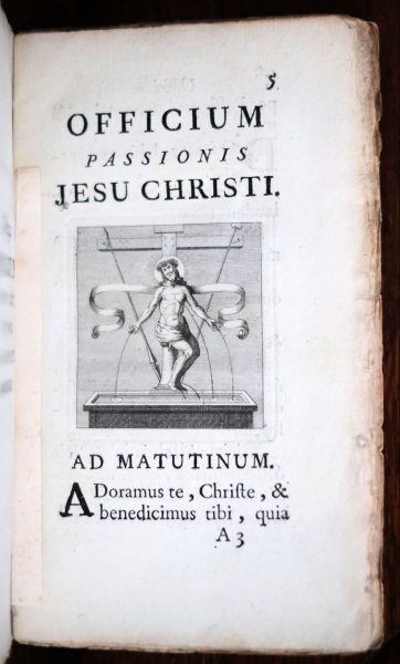 | Officium Passionis Jesu Christi Ex oraculis Prophetarum desumptum Parisiis Typis Benedicti Morin, Bibliopolae, via Jacobaea, sub signo VeritatisOfficium Passionis Jesu Christi Ex oraculis Prophetarum desumptum Parisiis Typis Benedicti Morin, Bibliopolae, via Jacobaea, sub signo Veritatis