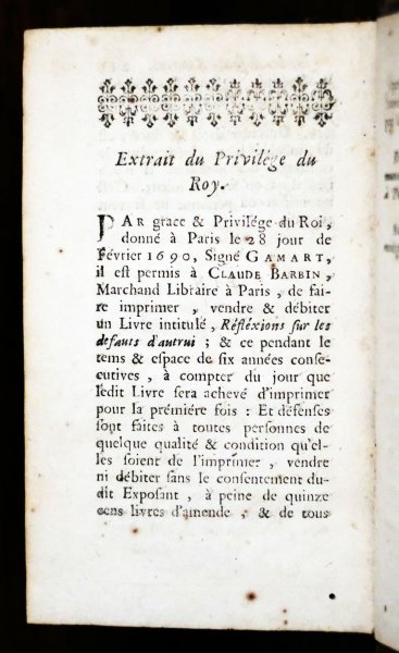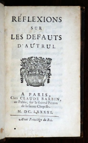 | Reflexions sur les Defauts d'Autrui a Paris chez Claude Barbin au Palais, sur le second Perron de la Sainte Chapelle MDCLXXXXI avec Privilége du RoiReflexions sur les Defauts d'Autrui a Paris chez Claude Barbin au Palais, sur le second Perron de la Sainte Chapelle MDCLXXXXI avec Privilége du Roi