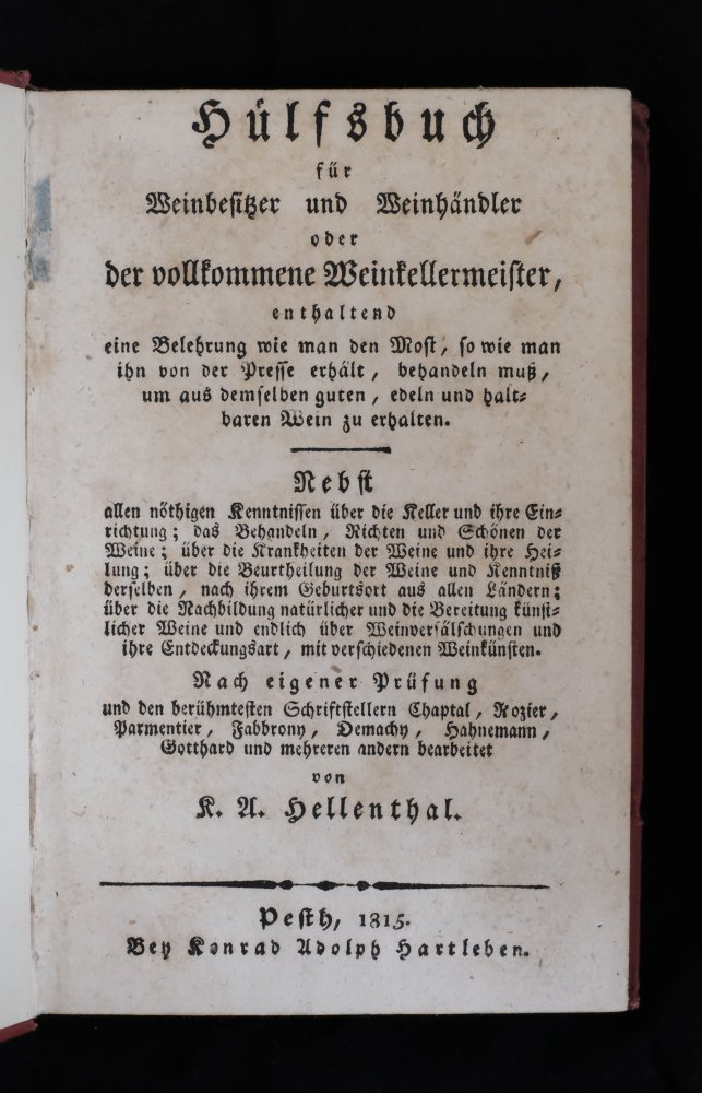 | Hülfsbuch für Weinbesitzer und Weinhändler oder der vollkommende Weinkellermeister, enthaltend eine Belehrung wie man den Most, so wie man ihn von der Presse erhält, behandeln muß, um aus demselb...Hülfsbuch für Weinbesitzer und Weinhändler oder der vollkommende Weinkellermeister, enthaltend eine Belehrung wie man den Most, so wie man ihn von der Presse erhält, behandeln muß, um aus demselben guten, edeln und haltbaren Wein zu erhalten, nebst allen nöthigen Kenntnissen über die Keller und ihre Einrichtung; das Behandeln, Richten und Schönen der Weine; über die Krankheiten der Weine und ihre Heilung; über die Beurtheilung der Weine und Kenntniß derselben, nach ihrem Geburtsort aus allen Ländern; über die Nachbildung natürlicher und die Bereitung künstlicher Weine und endlich über Weinverfälschungen und ihre Entdeckungsart, mit verschiedenen Weinkünsten.